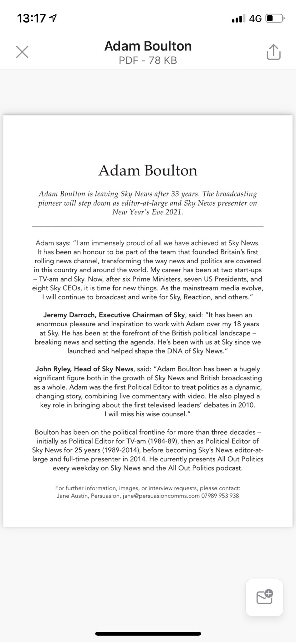 ADAM BOULTON has quit his role as a presenter on Sky News after 33 years claiming the direction the channel is heading towards is not a good fit for him By. Adam Boulton has said his decision to leave Sky News after more than three decades was a mutual one.